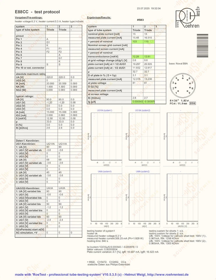 Bei beiden Röhren wurde auf einem Mercury 2000-Röhrentester ein NOS-Test ( 100 % + nominaler Wechselleitwert ) durchgeführt, mit folgendem Ergebnis (Wechselleitwert in uMhos und Prozentsatz des Nominalwerts):
