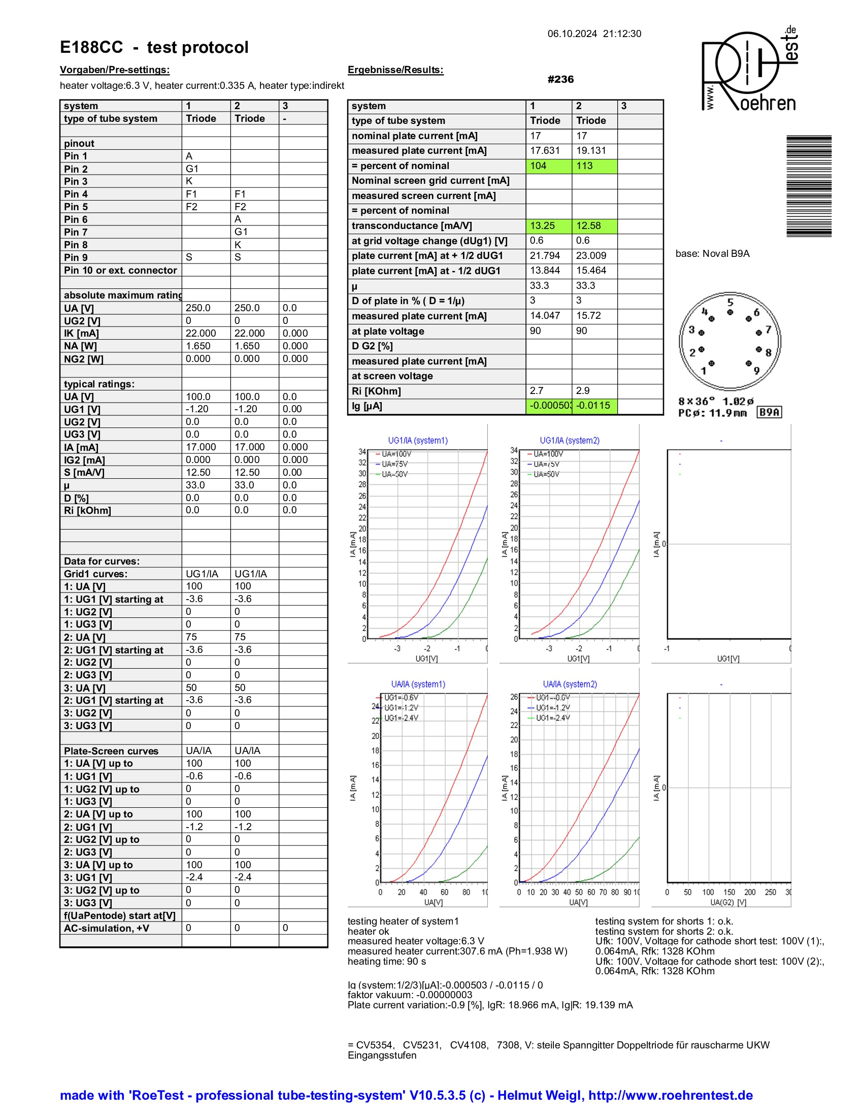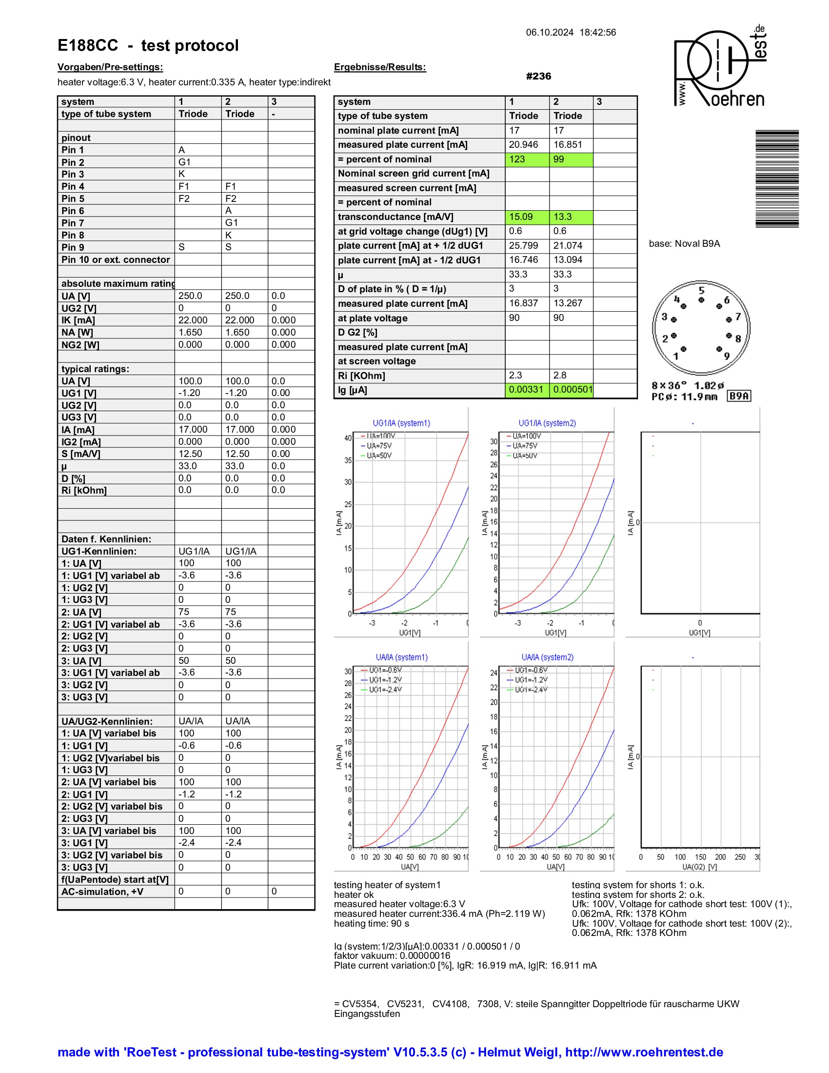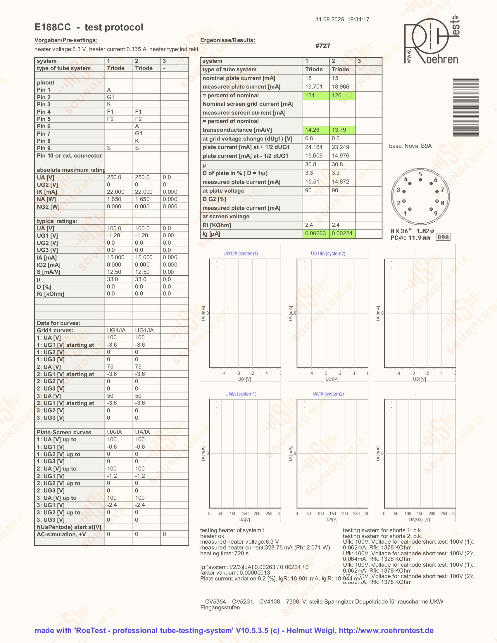 Bei beiden Röhren wurde auf einem zuverlässigen Mercury 2000-Röhrentester ein NOS- Test (100 %+ nominaler Wechselleitwert) mit folgendem Ergebnis durchgeführt (Wechselleitwert sowohl in uMhos als auch in Prozent des Nominalwerts ):