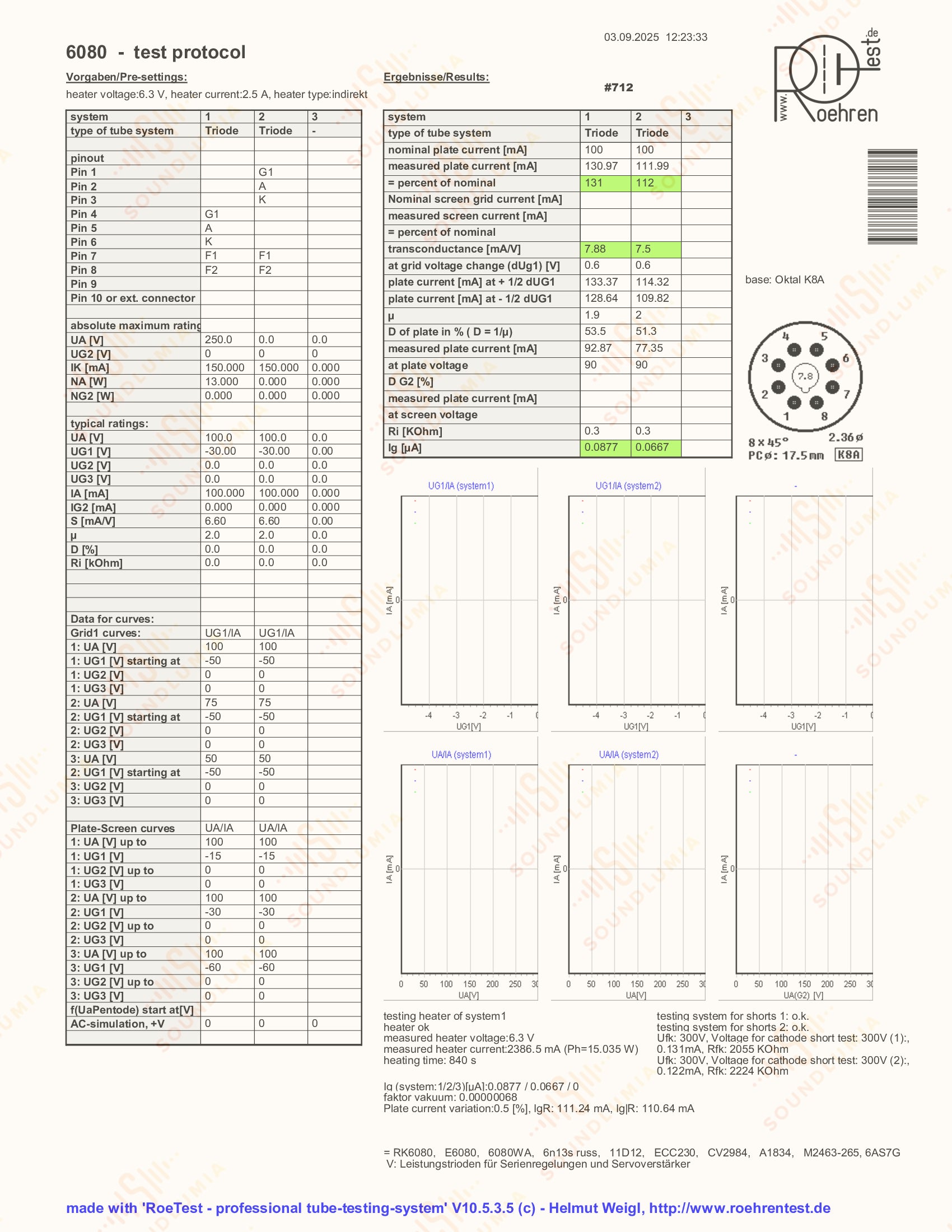 使用可靠且最近校准过的 Mercury 2000 真空管测试仪对Strong NOS (110%+ 标称互电导率)真空管进行了测试,结果如下。